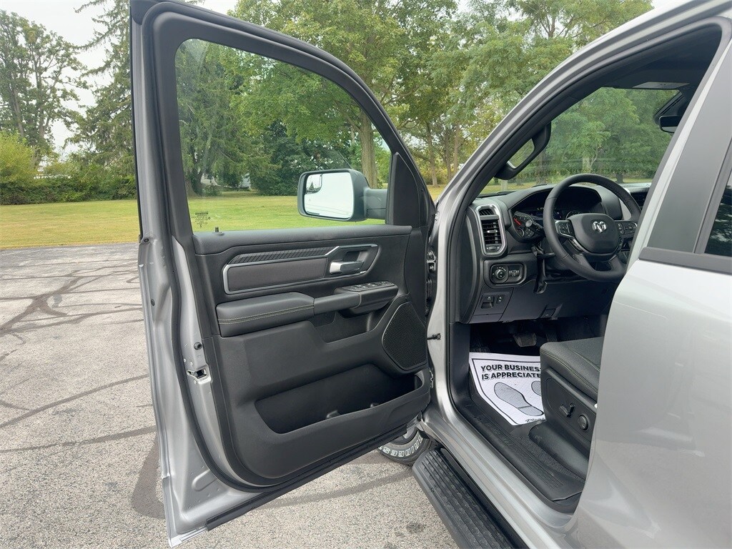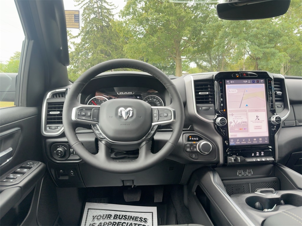 115V Auxiliary Power Outlet, 115V Auxiliary Rear Power Outlet, 12" Touchscreen Display, 2nd Row In Floor Storage Bins, 3 Rear Seat Head Restraints, 33 Gallon Fuel Tank, 4 Way Front Headrests, 4-Wheel Disc Brakes, 400W Inverter, 48V Belt Starter Generator, 4G LTE Wi-Fi Hot Spot, 6 Speakers, 9 Amplified Speakers w/Subwoofer, ABS brakes, Accent Color Door Handles, Accent Color Premium Power Mirrors, Accent Color Tailgate Handle, Air Conditioning, Air Conditioning ATC w/Dual Zone Control, Alloy wheels, AM/FM radio, Anti-Spin Differential Rear Axle, Apple CarPlay, Apple CarPlay/Android Auto, Auto High-beam Headlights, Auto Power-Folding Mirrors, Auto-Dimming Exterior Driver Mirror, Auto-Dimming Rear-View Mirror, Big Horn Level 2 Equipment Group, Black Exterior Mirrors, Black Exterior Truck Badging, Black Headlamp Bezels, Black Interior Accents, Black Painted Exterior Mirrors Caps, Black Premium Power Mirrors, Black Tail Lamp Bezels, Body Color Fender Flares, Body Color Front Bumper, Body Color Rear Bumper w/Step Pads, Brake assist, Bucket Seats, Bumpers: chrome, Center Console Parts Module, Cloth Bucket Seats, Cluster 7.0" TFT Color Display, Compass, Configurable Drive Mode, Connected Travel & Traffic Services, Connectivity - US/Canada, Convex Wide-Angle Exterior Mirror Insert, Delay-off headlights, Deluxe Cloth Bucket Seats, Disassociated Touchscreen Display, Driver door bin, Dual Exhaust w/Black Tips, Dual front impact airbags, Dual front side impact airbags, Electronic Stability Control, Exterior Mirrors Courtesy Lamps, Exterior Mirrors w/Heating Element, Exterior Mirrors w/Supplemental Signals, Front anti-roll bar, Front Bucket Seats, Front Center Armrest w/Storage, Front fog lights, Front License Plate Bracket, Front reading lights, Front Seat Back Map Pockets, Front wheel independent suspension, Full Length Floor Console, Fully automatic headlights, Global Telematics Box Module (TBM), Glove Box Lamp, Google Android Auto, GPS Antenna Input, GPS Navigation, Grille Black Surround Black Mesh, HD Radio, Heated door mirrors, Heated Front Seats, Heated Steering Wheel, Illuminated entry, Integrated Center Stack Radio, Integrated Voice Command w/Bluetooth, Leather Wrapped Steering Wheel, LED Dome Lamp w/On/Off Switch, LED Footwell Lighting, Low tire pressure warning, Manual Adjust 4-Way Driver Seat, Manual Adjust 4-Way Front Passenger Seat, Manual Folding Exterior Mirrors, Media Hub w/2 Charge Only USBs, Mopar Black Tubular Side Steps, MOPAR Front & Rear Rubber Floor Mats, MyFlexCare Service Plan, Night Edition, Occupant sensing airbag, Outside temperature display, Overhead airbag, Overhead console, Overhead LED Lamps, Panic alarm, ParkView Rear Back-Up Camera, Passenger door bin, Passenger vanity mirror, Power 2-Way Driver Lumbar Adjust, Power Adjust 8-Way Driver Seat, Power Adjustable Pedals, Power door mirrors, Power steering, Power windows, Premium Overhead Console, Quick Order Package 27Z Big Horn, Radio data system, Radio: Uconnect 5 Nav w/12.0" Display, Radio: Uconnect 5 W w/8.4" Display, RAM Grille Badge - Black, RAM Grille Badge - Chrome, Rear 60/40 Folding Seat, Rear anti-roll bar, Rear Center Armrest, Rear Power Sliding Window, Rear step bumper, Rear Wheelhouse Liners, Rear Window Defroster, Remote keyless entry, Remote Tailgate Release, Security Alarm, SiriusXM Radio Service, SiriusXM w/360L, Speed control, Steering Wheel Mounted Audio Controls, Sun Visors w/Illuminated Vanity Mirrors, Supplier Part Tracking (J-1), Tachometer, Telescoping steering wheel, Tilt steering wheel, Traction control, Trailer Brake Control, Trip computer, Universal Garage Door Opener, USB Host Flip, Variably intermittent wipers, Voltmeter, Wheels: 18" x 8" Cast-Aluminum Painted, Wheels: 20" x 9.0" Aluminum Painted Clad, Wheels: 20" x 9" Aluminum Chrome Clad (WRK).