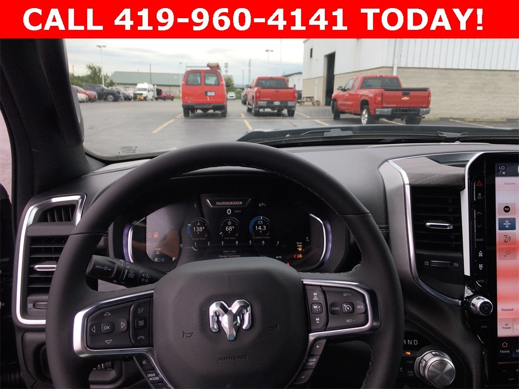 10 Speakers, 14.4" Touchscreen Display, 3.55 Rear Axle Ratio, 4-Wheel Disc Brakes, 4G LTE Wi-Fi Hot Spot, ABS brakes, Accent Color Door Handles, Accent Color Premium Power Mirrors, Accent Color Tailgate Handle, Air Conditioning, Alloy wheels, AM/FM radio: SiriusXM with 360L, Anti-Spin Differential Rear Axle, Apple CarPlay, Apple CarPlay/Android Auto, Audio memory, Auto High-beam Headlights, Auto Power-Folding Mirrors, Auto-dimming door mirrors, Auto-Dimming Exterior Driver Mirror, Auto-dimming Rear-View mirror, Automatic temperature control, Black Exterior Truck Badging, Black Headlamp Bezels, Black Interior Accents, Black Painted Exterior Mirrors Caps, Black Tail Lamp Bezels, Body Color Front Bumper, Body Color Rear Bumper w/Step Pads, Brake assist, Bumpers: chrome, Chrome Exterior Mirrors, Cluster 12" TFT Color Display, Compass, Connected Travel & Traffic Services, Connectivity - US/Canada, Convex Wide-Angle Exterior Mirror Insert, Delay-off headlights, Disassociated Touchscreen Display, Dome Dual LED Reading Lamp, Driver door bin, Driver vanity mirror, Dual Exhaust w/Black Tips, Dual front impact airbags, Dual front side impact airbags, Dual Wireless Charging Pad, Dual-Pane Panoramic Sunroof, Electronic Stability Control, Exterior Mirrors Approach Lamps, Exterior Mirrors Courtesy Lamps, Exterior Mirrors w/Heating Element, Exterior Mirrors w/Memory, Exterior Mirrors w/Supplemental Signals, Front anti-roll bar, Front Bucket Seats, Front Center Armrest w/Storage, Front dual zone A/C, Front fog lights, Front License Plate Bracket, Front Passenger Interactive Display, Front reading lights, Front wheel independent suspension, Fully automatic headlights, Garage door transmitter, Global Telematics Box Module (TBM), Google Android Auto, GPS Antenna Input, GPS Navigation, Grille Surround 3 Black Texture 2 Black, harman/kardon 19 Speaker Premium Sound, HD Radio, Heated door mirrors, Heated front seats, Heated rear seats, Heated steering wheel, Illuminated entry, Integrated Center Stack Radio, Integrated Voice Command w/Bluetooth, Laramie Level 2 Equipment Group, Leather steering wheel, Leather Trimmed Bucket Seats, LED Dome/Reading Lamp, Low tire pressure warning, Memory seat, Mopar Black Tubular Side Steps, MOPAR Front & Rear Rubber Floor Mats, Navigation System, Night Edition, Occupant sensing airbag, Off-Road Information Pages, Outside temperature display, Overhead airbag, Overhead console, Panic alarm, ParkView Rear Back-Up Camera, Passenger door bin, Passenger vanity mirror, Pirelli Brand Tires, Power door mirrors, Power driver seat, Power passenger seat, Power steering, Power Tailgate, Power windows, Proximity Approach/Departure Lamps, Quick Order Package 21H Laramie, Radio data system, Radio: Uconnect 5 Nav w/12.0" Display, Radio: Uconnect 5 Nav w/14.4" Display, Rain Sensitive Windshield Wipers, RAM Grille Badge - Black, RAM Grille Badge - Chrome, Rear anti-roll bar, Rear reading lights, Rear seat center armrest, Rear step bumper, Remote keyless entry, Secondary Active Grille Shutters, Security system, SiriusXM Radio Service, SiriusXM w/360L, Smartphone As A Key Capable, Speed control, Split folding rear seat, Sport Performance Hood, Steering wheel mounted audio controls, Tachometer, Telescoping steering wheel, Tilt steering wheel, Traction control, Trailer Brake Control, Trip computer, Turn signal indicator mirrors, USB Host Flip, Variably intermittent wipers, Ventilated front seats, Voltmeter, Wheels: 20" x 9" Premium Paint/Polish, Wheels: 22" x 9" Forged Aluminum.