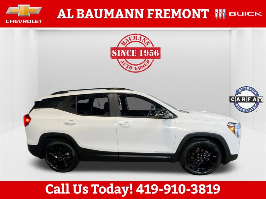 Odometer is 5628 miles below market average! CARFAX One-Owner.Summit White 2023 GMC Terrain SLE 4D Sport Utility 1.5L DOHC 9-Speed Automatic FWDONLY ONE OWNER.Car shopping is sometimes inconvenient and stressful, and we want to take the hassle out of this all-too-common experience. If youâre interested in more convenience, less frustration and a process that works efficiently to meet your needs as a customer. Al BAUMANN AUTO GROUP. The Best Price Up Front Cash Offers For Any Trade-In Multiple Financing Quotes In Minutes A Team Of Dedicated Salespeople.CALL,419-332-8236 or {1-866-330-3601}, 110-Volt Power Outlet, 2 USB Data Ports, 2 USB Data Ports w/SD Card Reader, 4.2 Multi-Color Driver Information Screen, 8-Way Power Driver Seat Adjuster, Adaptive Cruise Control, Black GMC Center Caps w/Red GMC Lettering, Black Mirror Caps, Darkened Front Grille, Driver & Front Passenger Heated Seats, Driver Convenience Package, Dual-Zone Automatic Climate Control, Elevation Edition, HD Rear Vision Camera, Infotainment Package I, Lane Change Alert w/Side Blind Zone Alert, Outside Heated Power-Adjustable Mirrors, Power Driver Lumbar Control, Preferred Equipment Group 3SA, Radio: GMC Infotainment Audio System w/Navigation, Rear Cross-Traffic Alert, Rear Park Assist, Remote Start, Roof-Mounted Luggage Rack Side Rails, Safety Alert Seat, Side Blind Zone & Rear Cross Traffic, SiriusXM Radio, Terrain Pro Safety Plus, Wheels: 19 Gloss Black Aluminum, 2 USB Data Ports w/Auxiliary Input Jack, 3.47 Axle Ratio, 4-Way Manual Driver's Seat, 4-Way Manual Front Passenger Seat, 4-Wheel Disc Brakes, 6 Speakers, 6-Speaker Audio System Feature, ABS brakes, Air Conditioning, Alloy wheels, AM/FM radio: SiriusXM, Auto High-beam Headlights, Auto-dimming Rear-View mirror, Automatic temperature control, Bluetooth® For Phone, Brake assist, Bumpers: body-color, Cold Air Grille Shutter, Compass, Delay-off headlights, Driver door bin, Driver vanity mirror, Dual front impact airbags, Dual front side impact airbags, Electronic Stability Control, Emergency communication system: OnStar and GMC connected services capable, Four wheel independent suspension, Front anti-roll bar, Front Bucket Seats, Front Center Armrest, Front reading lights, Fully automatic headlights, Heated door mirrors, Illuminated entry, Low tire pressure warning, Occupant sensing airbag, Outside temperature display, Overhead airbag, Overhead console, Panic alarm, Passenger door bin, Passenger vanity mirror, Power door mirrors, Power Programmable Rear Liftgate, Power steering, Power windows, Premium Cloth Seat Trim, Radio data system, Radio: GMC Infotainment Audio System w/7 Display, Rear anti-roll bar, Rear seat center armrest, Rear window defroster, Rear window wiper, Remote keyless entry, Security system, Skyscape Power Sunroof w/Power Sunscreen, Speed control, Speed-sensing steering, Split folding rear seat, Spoiler, Steering wheel mounted audio controls, Tachometer, Telescoping steering wheel, Tilt steering wheel, Traction control, Trip computer, Variably intermittent wipers, Wheels: 17 x 7 Silver Painted Aluminum, Wireless Apple CarPlay/Wireless Android Auto, 110-Volt Power Outlet, 2 USB Data Ports, 2 USB Data Ports w/SD Card Reader, 4.2 Multi-Color Driver Information Screen, 8-Way Power Driver Seat Adjuster, Adaptive Cruise Control, Black GMC Center Caps w/Red GMC Lettering, Black Mirror Caps, Darkened Front Grille, Driver & Front Passenger Heated Seats, Driver Convenience Package, Dual-Zone Automatic Climate Control, Elevation Edition, HD Rear Vision Camera, Infotainment Package I, Lane Change Alert w/Side Blind Zone Alert, Outside Heated Power-Adjustable Mirrors, Power Driver Lumbar Control, Preferred Equipment Group 3SA, Radio: GMC Infotainment Audio System w/Navigation, Rear Cross-Traffic Alert, Rear Park Assist, Remote Start, Roof-Mounted Luggage Rack Side Rails, Safety Alert Seat, Side Blind Zone & Rear Cross Traffic, SiriusXM Radio, Terrain Pro Safety P